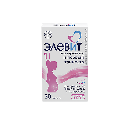 Элевит® 1 — Элевит Планирование и Первый Триместр БАД к пище. Рекомендован для применения с первого дня беременности и до начала 2-го триместра. Содержит специальную форму фолатов Метафолин для правильного формирования органов, комбинацию цинка и витаминов С и D3, синергично воздействующих на формирование здоровой имунной системы, и железо для полноценного кроветворения.