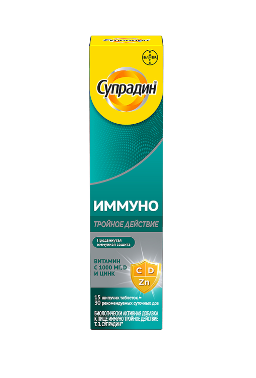 Биологически активная добавка к пище Иммуно Тройное действие товарного знака Супрадин® – активирует иммунную защиту благодаря усиленной формуле с высокой дозировкой витамина C, витамина D и цинка в одной таблетке, помогая не заболеть
